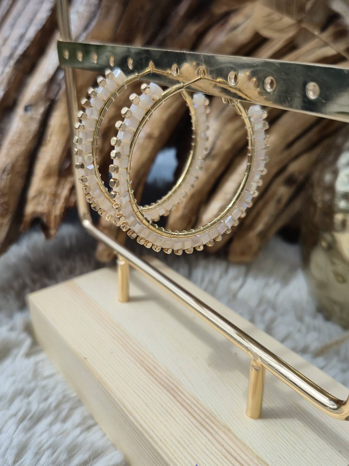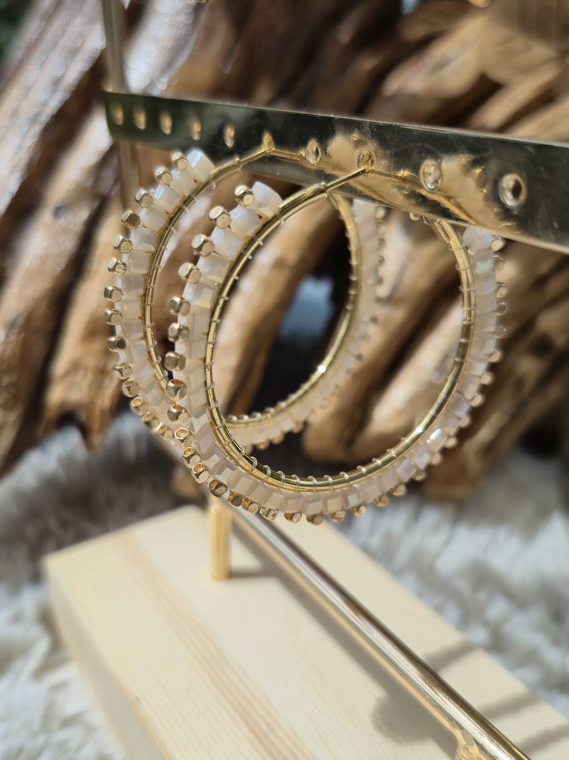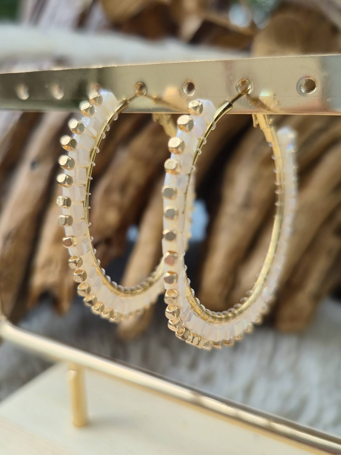 Lumineuse , fines et délicates, les créoles Kalea sont un rayon de soleil au creux des oreilles. Dorées et perlées de petits cubes nacrés irisés, elles apportent une touche chic et discrète à tous les looks, du plus simple au plus stylé.